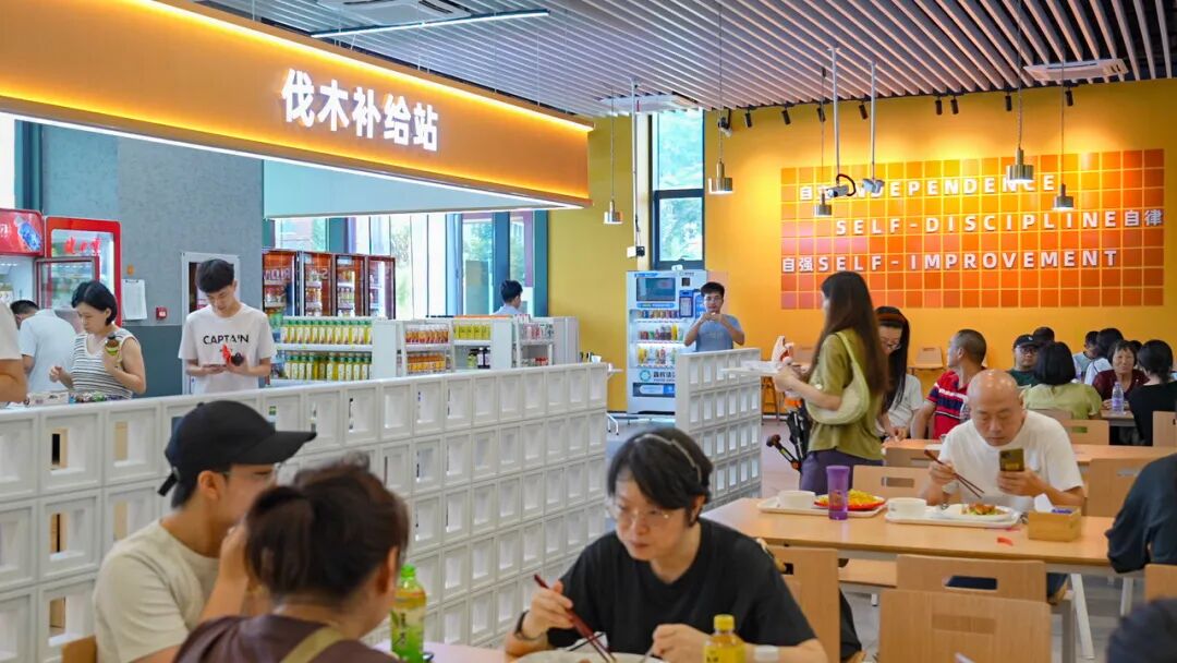这场 “非遗文化 + 趣味互动” 的开学活动,让新生们刚进校园就感受到了满满的暖意,也让返校的老生们频频惊喜:“这还是我熟悉的伐木餐厅吗?也太好看了吧!” 原来餐厅趁着暑假悄悄完成了装修升级 —— 原本简洁的空间焕然一新,灯光也变得更柔和,连取餐动线都优化得更顺畅,最贴心的是多了个 “伐木补给站”,摆满了各种零食、饮料等,赶课间隙来这儿随手拿点吃的,方便快捷。