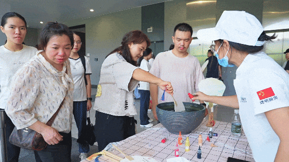 漆扇摊位,有的同学还亲自参与到制作过程中,在工作人员的指导下,绘制出属于自己的独特漆扇。